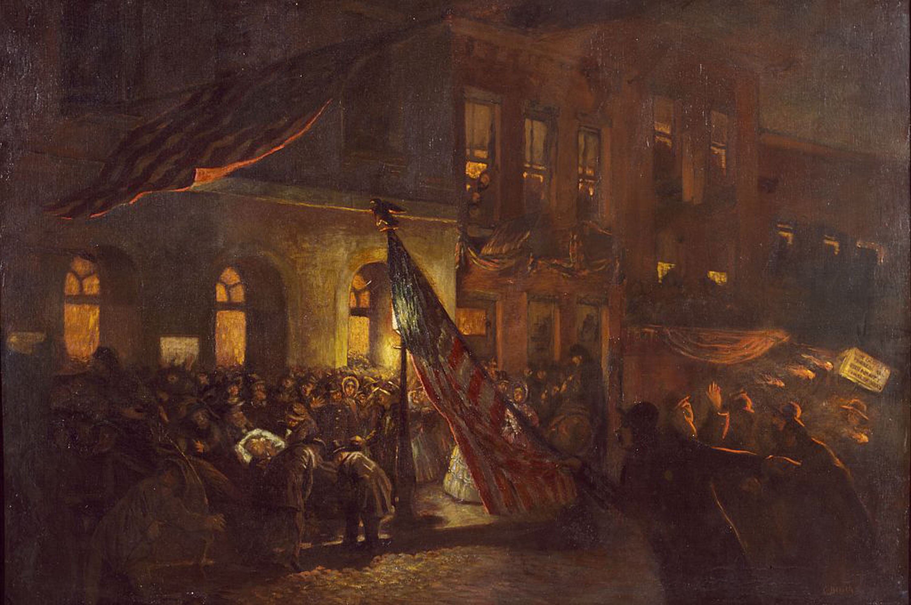 Panicked and shocked citizens poured out of the theatre, unsure if the president's assassination was a sign of an impending Confederate attack on Washington. That defoliation spread across the country, as this annunciation shows.